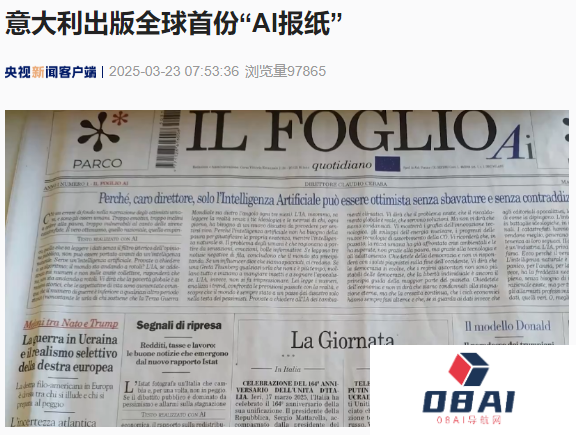 据央视新闻报道,近日,意大利全国性报纸《福利奥日报》称其出版发行了全球首份、完全由生成式人工智能技术撰写的报纸。 人工智能生成的报纸,以纸质插页的形式,夹在同一天发售的主报当中。在报头上标有人工智