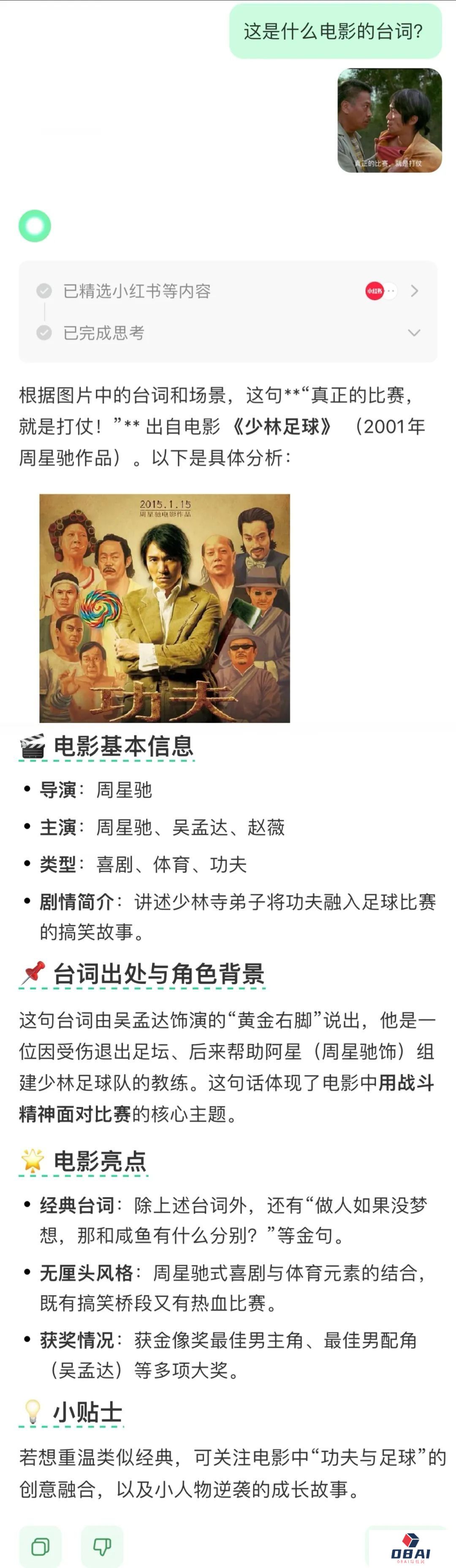 它就能把电影的基本信息、台词出处与角色背景、电影亮点等一股脑全扒出来。不过值得注意的是,点点有时候也会胡说八道。一开始它明明说的是,「真正的比赛,就是打仗」这句台词出自《少林足球》,但给出的海报却是《功夫》。这算是挂着羊头卖狗肉了。