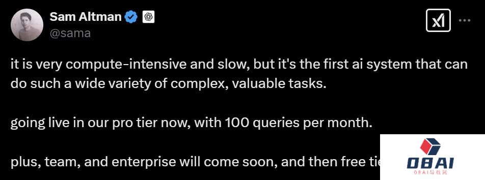 Altman表示,ChatGPT的“深度研究”功能目前仅向ChatGPT Pro订阅用户开放,每月限额100次查询,随后将逐步推广至Plus和Team用户,最终扩展至企业级(Enterprise)用户。预计Plus版本将在约一个月后推出,并且未来付费用户的查询限制将“显著提高”。