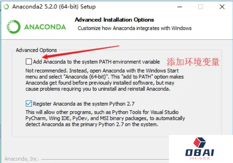 安装时选择添加环境变量,因为你电脑如果已经安装了Python, 选择第二个可能会版本冲突,如果你想整个系统都用anaconda的python,那就勾选上: