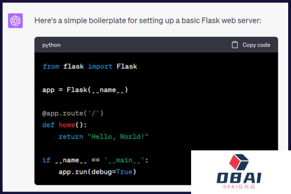 样板代码是指必须包含在许多地方的代码部分,几乎没有更改。一些例子包括:在 Python 中设置 Flask Web 服务器、Java 应用程序中的主方法声明、HTML 文件中的初始设置代码、代码的结构在不同的项目中往往保持不变。使用 ChatGPT 可以加快新项目或功能的设置过程。、样板代码包括基本结构、任何必要的依赖项和基本函数。这使您可以专注于构建应用程序的核心功能。