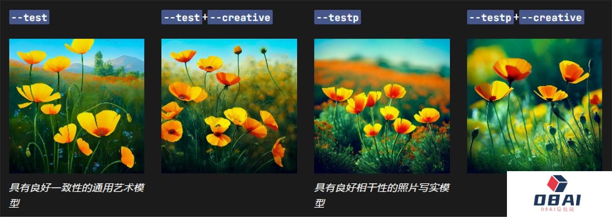 开发人员偶尔会临时发布新模型以供社区测试和反馈。目前有两种可用的测试模型:--test 和--testp,它们可以与--creative 参数结合使用以获得更多不同的成分。