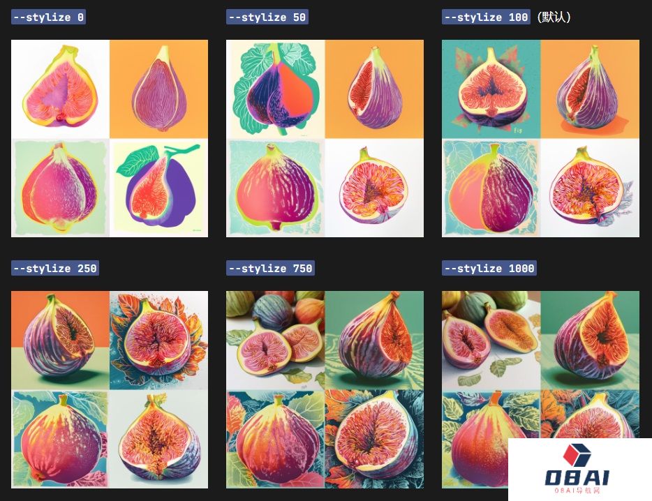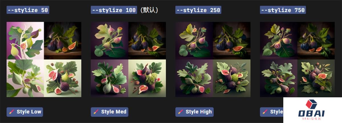 V5模型下默认值为100,数值范围 0~1000设置中 Low、Med、High、Very high 分别对应数值50、100、250、750使用 stylize 参数方法