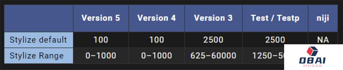 每个版本可以设置的数值不一,我们看一下不同的 Midjourney 版本模型具有不同的风格化范围。