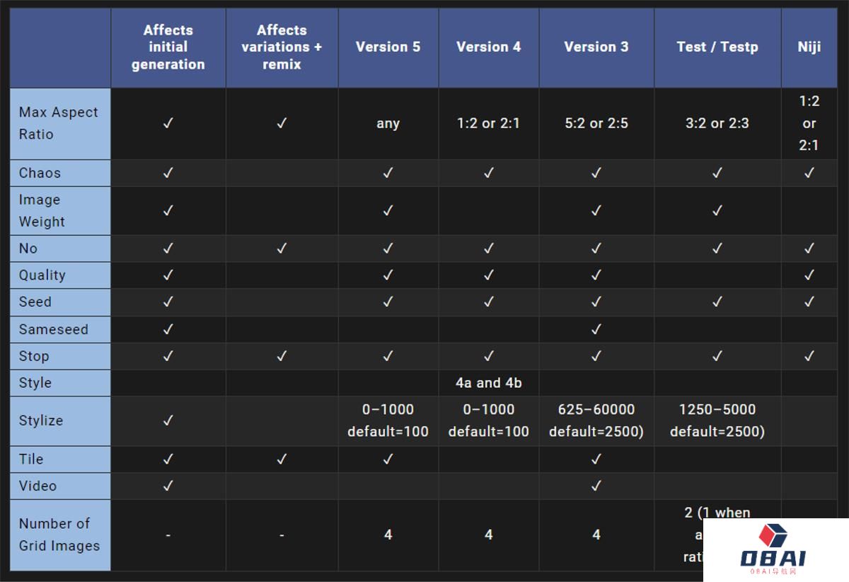 --creative 修改 test 和 testp 模型更加多样化和创造性;--iw 设置相对于文本权重的图像提示权重。默认值为 --iw 0.25;--sameseed 种子值创建一个大的随机噪声场,应用于初始网格中的所有图像。当指定 --sameseed 时,初始网格中的所有图像都使用相同的起始噪声,并将生成非常相似的生成图像;--video 保存正在生成的初始图像网格的进度视频。表情符号使用 ☉ 对完成的图像网格做出反应,以触发将视频发送到您的直模型版本和参数兼容性模型版本和参数兼容性