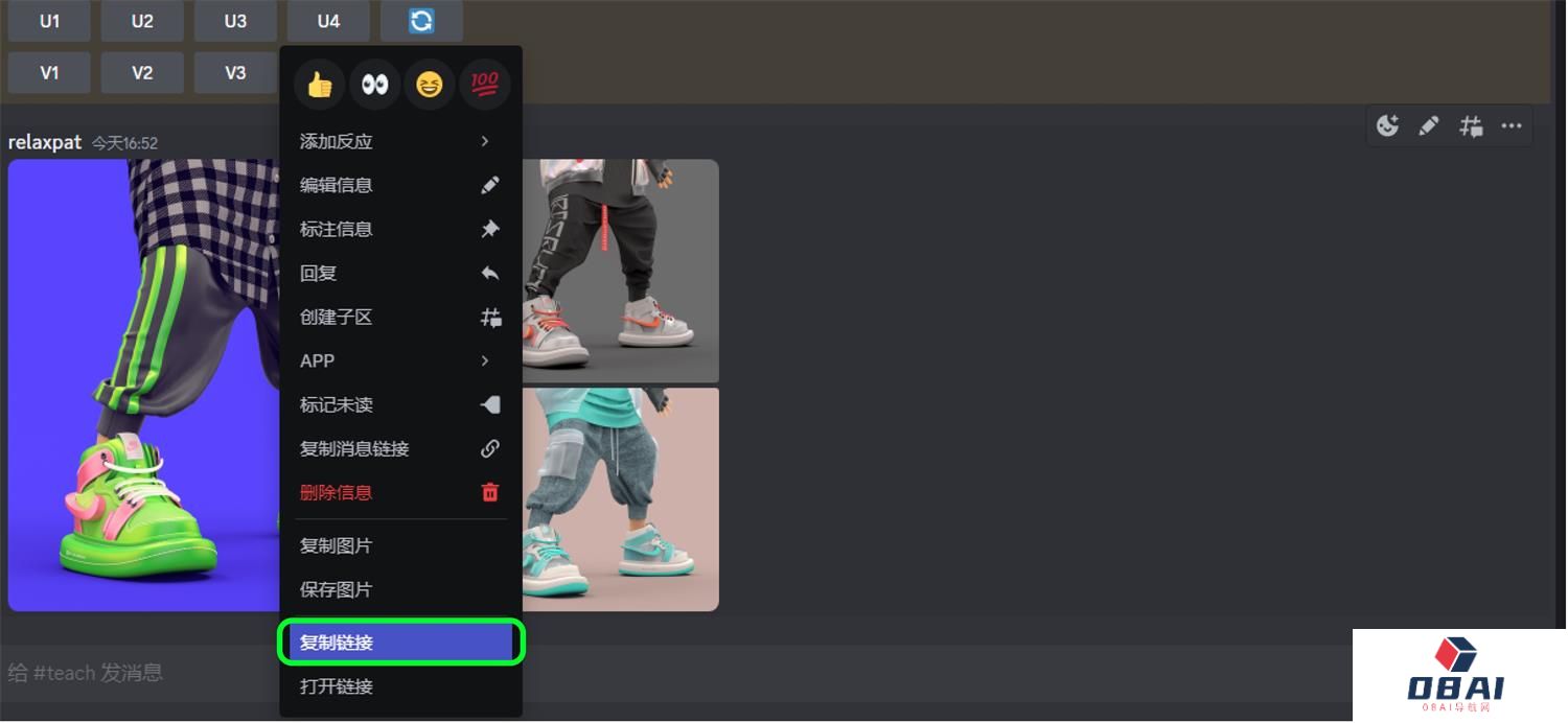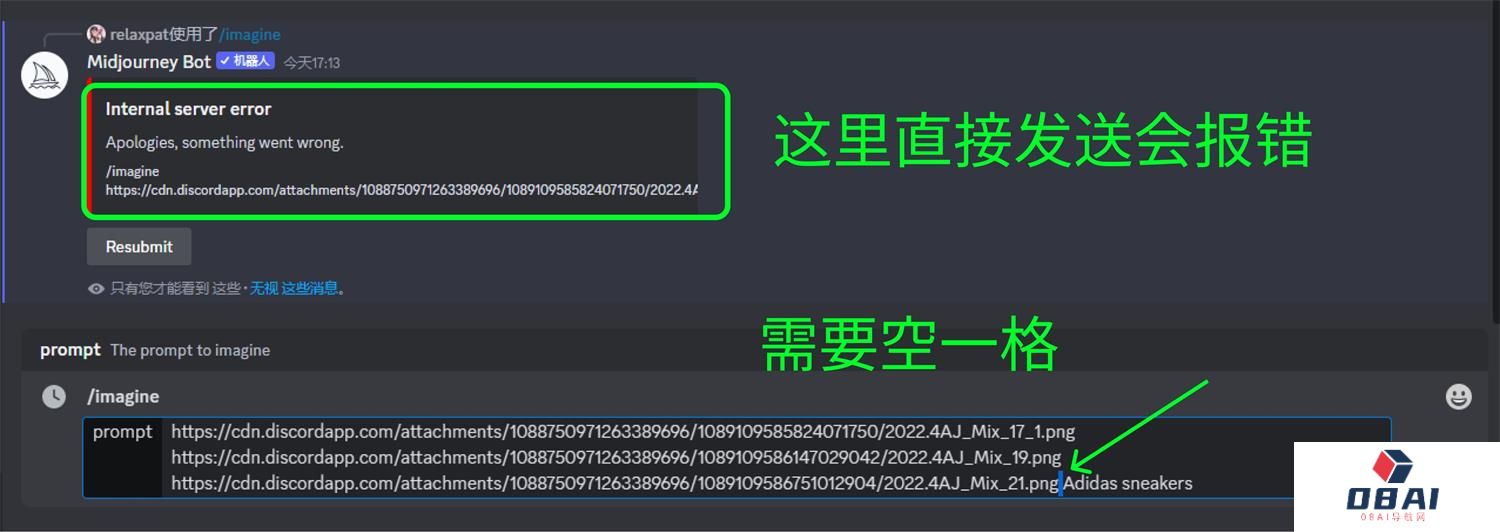 复制完链接之后还不能直接发送,直接发送会报错,这个跟“/blend”不一样,这个不是融图,你可以理解是给机器人作为参考。然后我们需要在链接后面打上关键词: