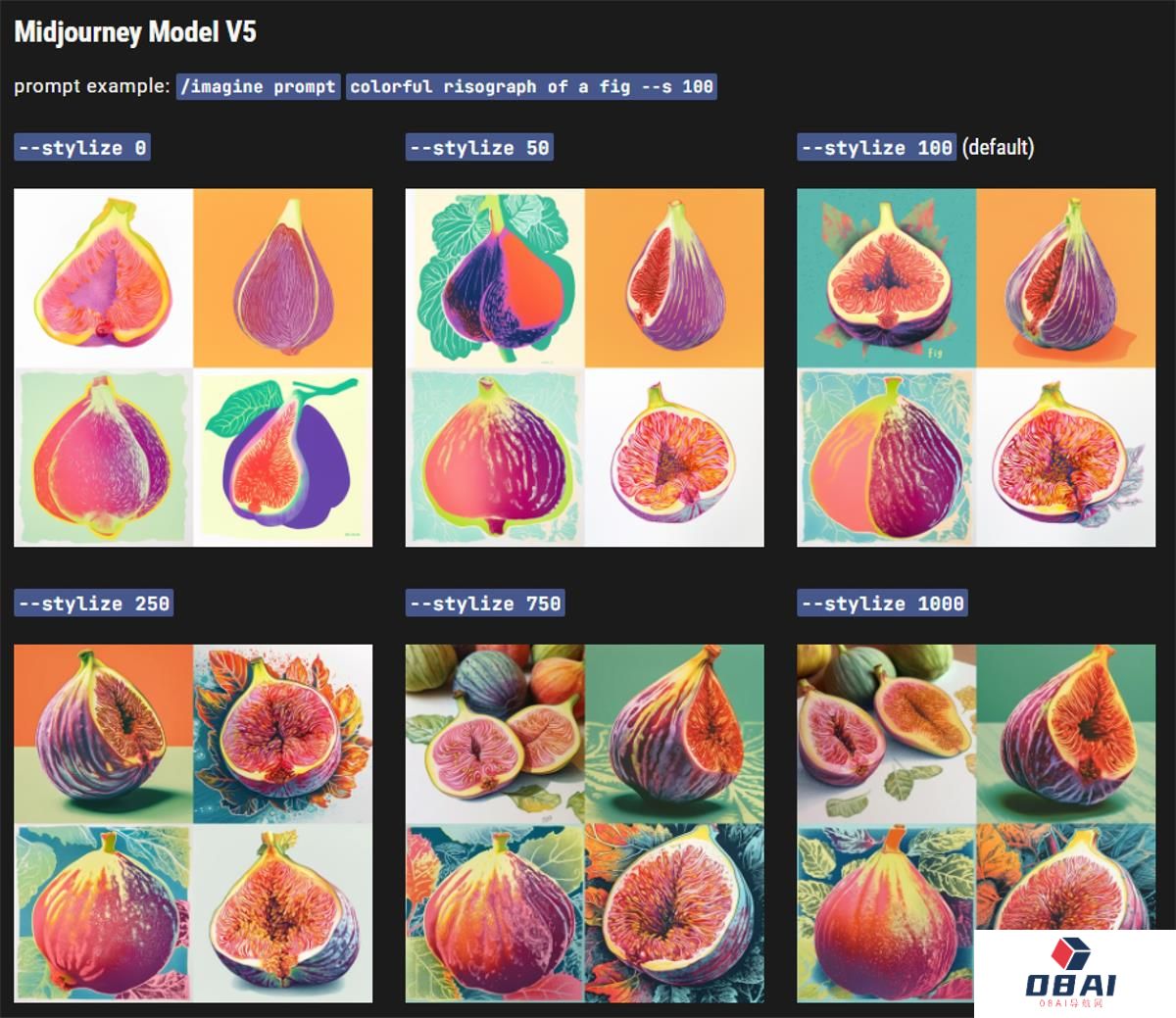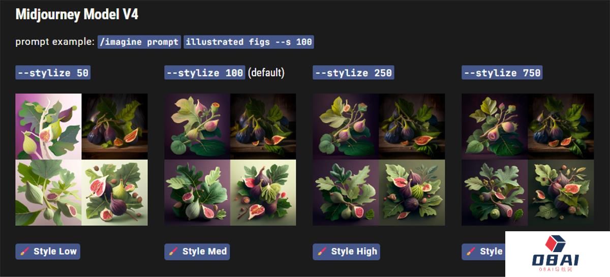 风格低 = --s 50,风格中 = --s 100,风格高 = --s 250,风格非常高 = --s 750,
