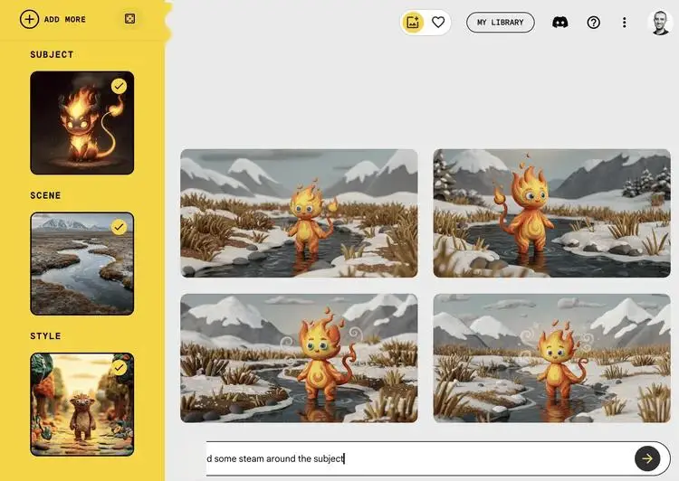 「Whisk」随后会生成图像,并为每张图像生成相应的文本提示。如果用户对生成结果满意,可以选择收藏或下载图像;如果需要进一步调整,则可以通过在文本框中输入更多文字或点击图像并编辑文本提示来进行优化。