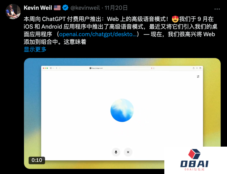 当地时间11月20日,OpenAI 首席产品官 Kevin Weil 通过推特(X)平台发布消息,OpenAI 高级语音模式(Advanced Voice)将在本周内上线 ChatGPT 网页版,面向付费用户开启。