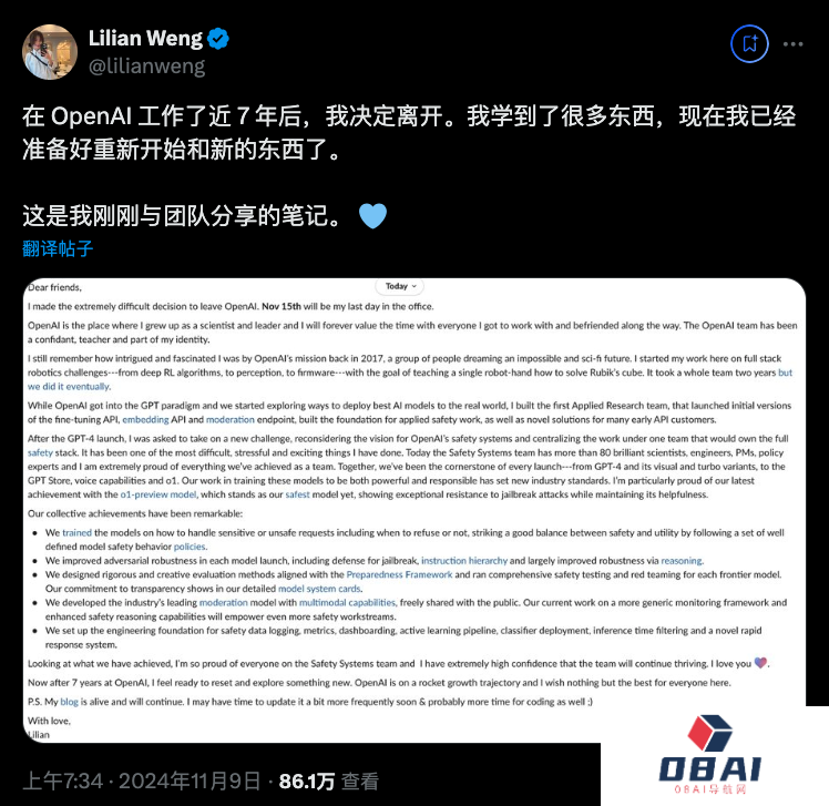 当地时间11月9日,现任的 OpenAI 安全系统团队负责人翁荔(Lilian Weng)在 X 平台宣布,她将于 11 月 15 日从该公司离职,结束在 OpenAI 长达七年的职业生涯。