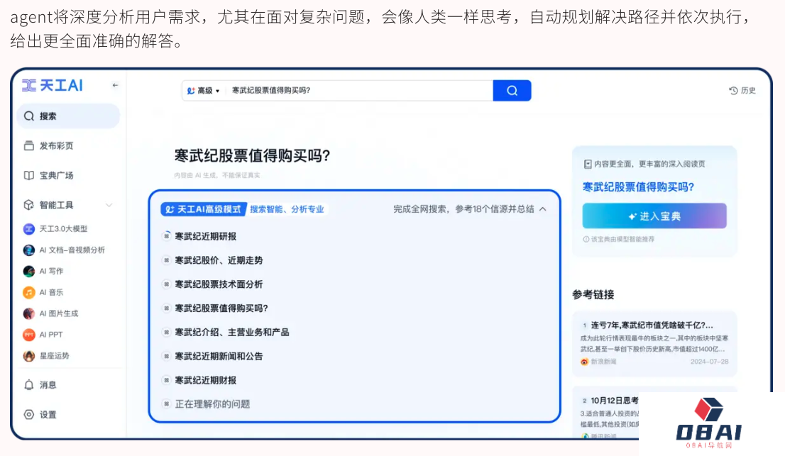 全面升级多层次分析推理能力升级的金融投资专业 AI 搜索升级的科研学术专业 AI 搜索针对文档 AI 阅读分析的智能优化针对复杂任务,天工 AI 的推理能力全面升级,支持难题拆解 + 自动规划 + 主动扩展 + 深度回答 + 图文交织,模拟人类的思考模式。
