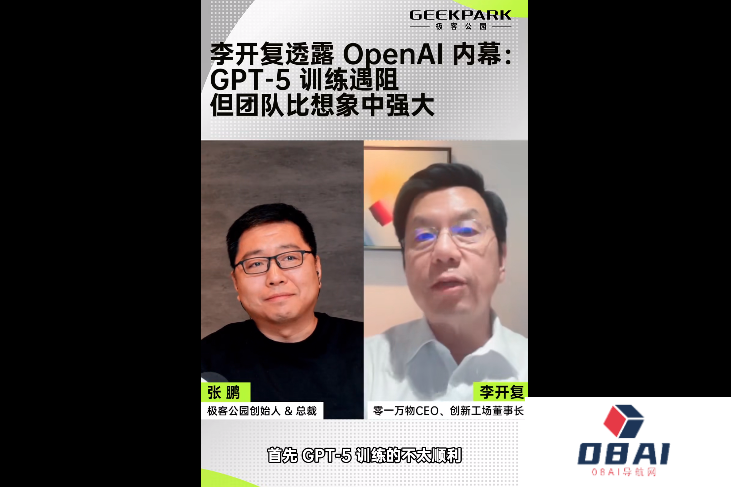 10月16日,国内人工智能创业公司“零一万物”CEO李开复与极客公园创始人张鹏进行了线上对话。李开复首先辟谣了关于“零一万物”要放弃训练基础大模型的流言。在访谈中,他聊到自己最近在美国走访的经历,透露 OpenAI 在训练 GPT-5 的时候遇到了困难。