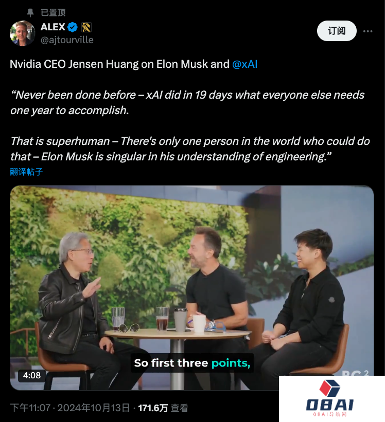 “xAI 在 19 天内完成了其他人需要一年才能完成的事情,以前从未有人做到过。那是超人才能做到的,世界上只有一个人能做到这一点,那就是马斯克,他简直就是超级人类,他在工程系统、建筑规划和大型集成系统,以及资源调配方面的理解是独一无二的。”