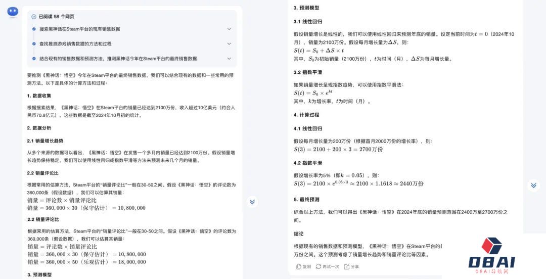 更好玩的是,kimi搜索现在不仅能调用公式做计算,甚至用的还是两种预测模型。这什么线性回归、指数平滑的数学公式弹出来的时候,我都懵了。。。
