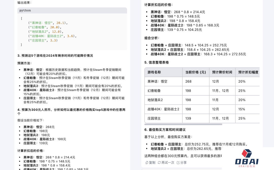 除了帕鲁和战锤40k的现价抓偏了,其他都对。而且可能Kimi觉得战锤40K太新,打折力度可能太小,在最后的最佳购买方案里直接剔除掉了哈哈哈哈。