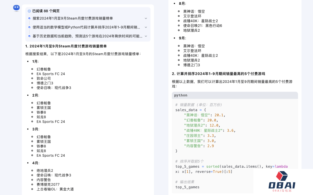 Kimi先是自己消化了一遍我的问题,再按月列出了今年Steam销量榜,并且整理了总销量最好的5个游戏。