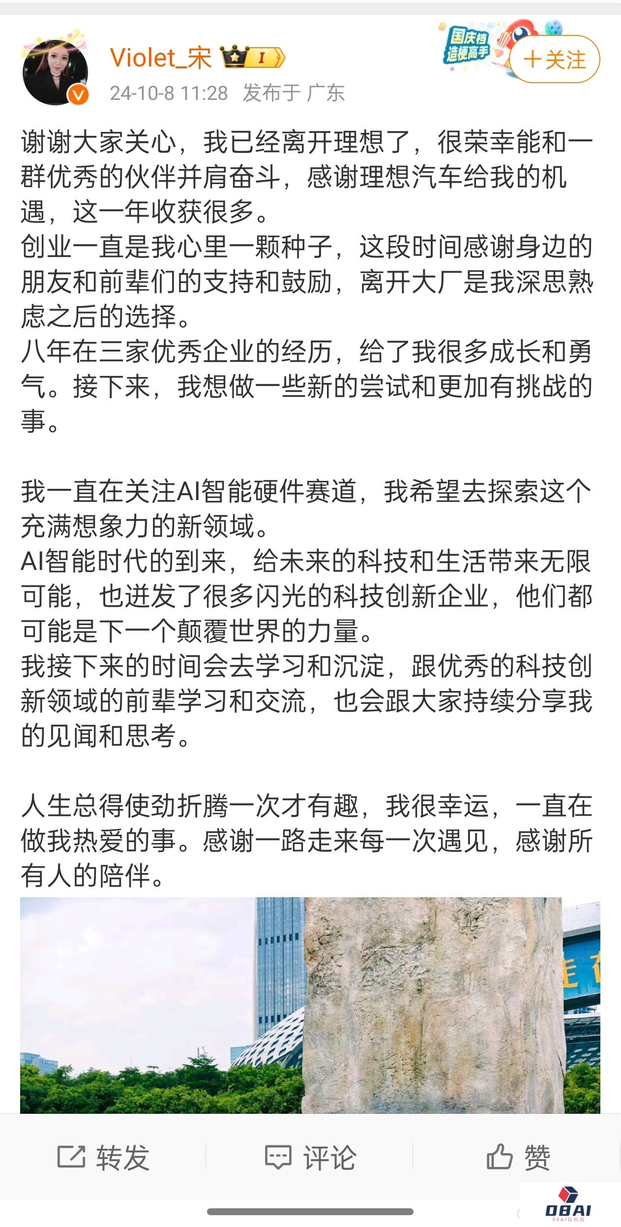 宗紫薇在长文中写道:「创业一直是我心里一颗种子,这段时间感谢身边的朋友和前辈们的支持和鼓励,离开大厂是我深思熟虑之后的选择。我一直在关注 AI 智能硬件赛道,我希望去探索这个充满想象力的新领域。」