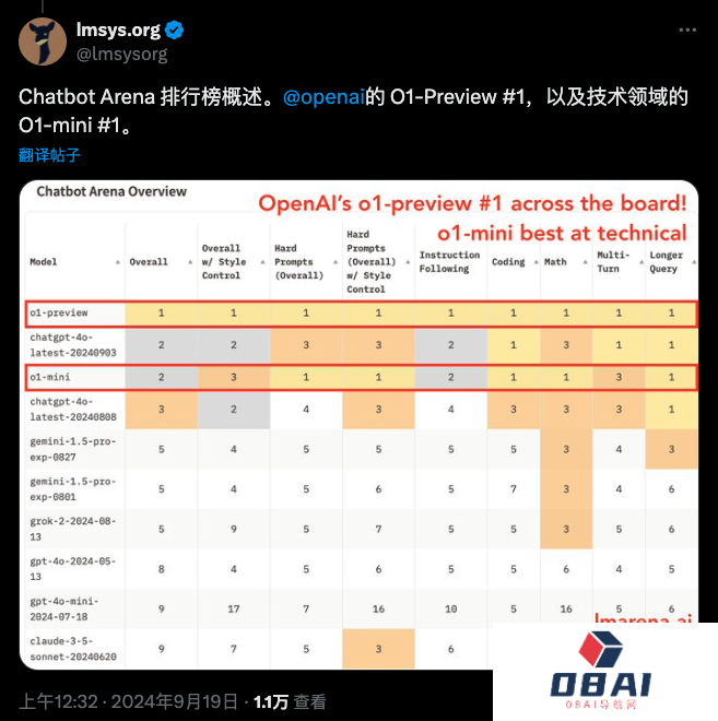 有网友整理了“聊天机器人竞技场”提供的 OpenAI o1 系列大模型的测试图表,图中清楚地显示,o1-preview 和 o1-mini 在几乎所有的测试项目取得了第一的排名,远高于其他模型的表现,也只有自家的旗舰模型 GPT-4o(20240903版本) 可以与之过手。