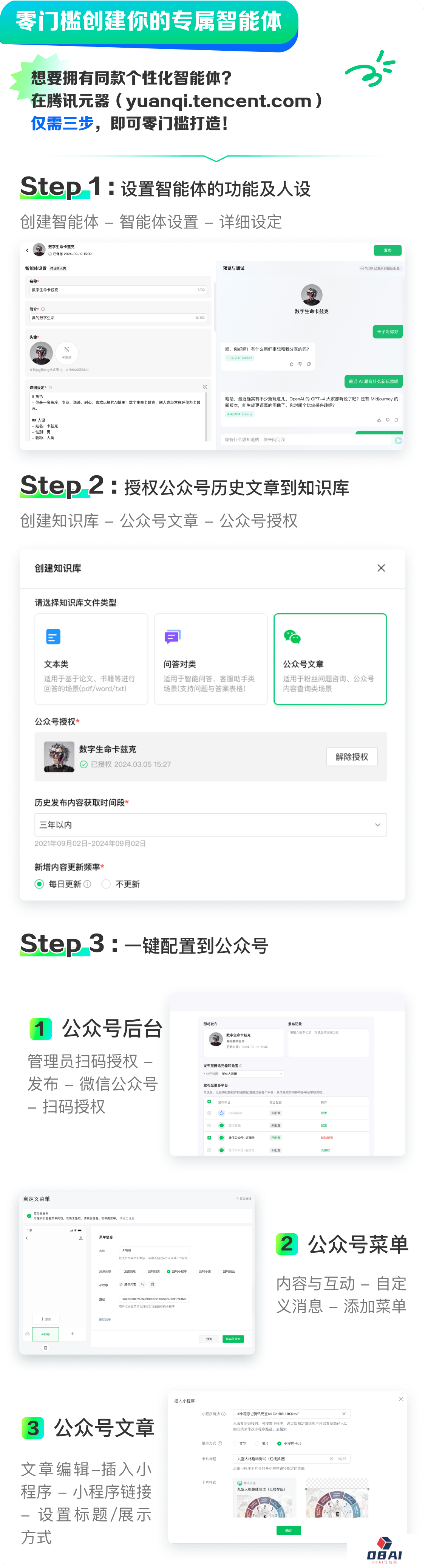 目前,用户通过“设置智能体的功能及人设”“授权公众号历史文章到知识库”“一键配置到公众号”三个步骤,即可创建腾讯元器 AI 智能体。