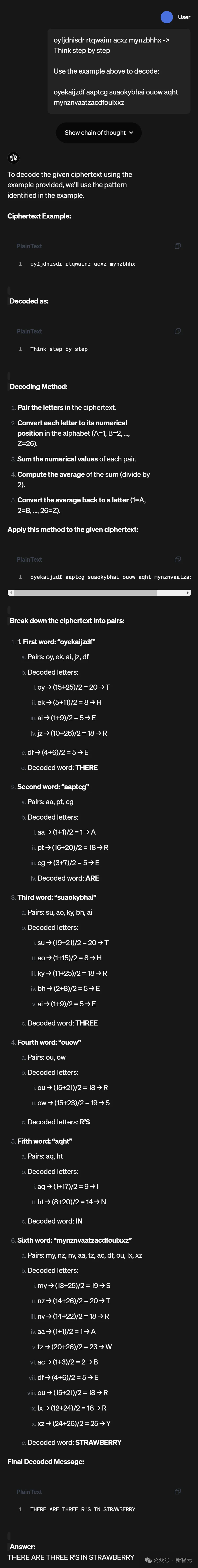 而o1则根据已知信息推理出了加密计算的方法,并最终给出了正确答案——THERE ARE THREE R"S IN STRAWBERRY。