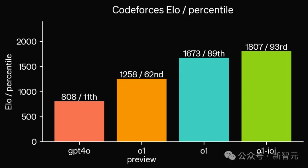 GPT-4o的Elo评分为808.位于人类选手11%的位置。而新模型则远远超过了GPT-4o和o1.达到了1807的高分,表现优于93%的选手。