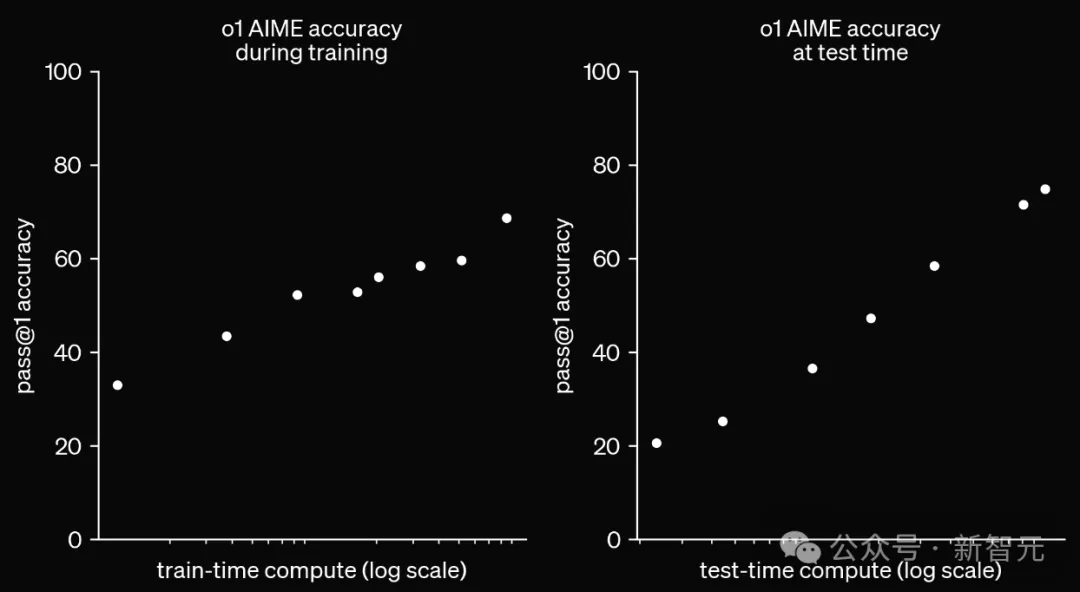 o1的性能,随着更多的强化学习(训练时间计算)和更多的思考时间(测试时间计算)投入,性能不断提高。