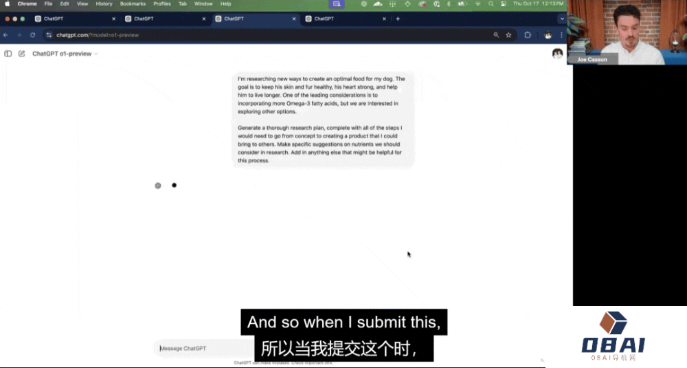 最后,他展示了如何用o1-preview帮助制定一份狗狗的最佳饮食计划等。