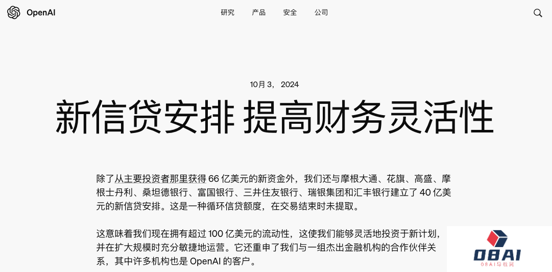 报道称,基本信贷额度为 40 亿美元,并可选择再增加 20 亿美元。该贷款是无担保的,可以在三年内提取。这意味着,目前 OpenAI 可调用的资金已经达到了 126 亿美元,基本可以确保未来三年的各项开支与研发投入。