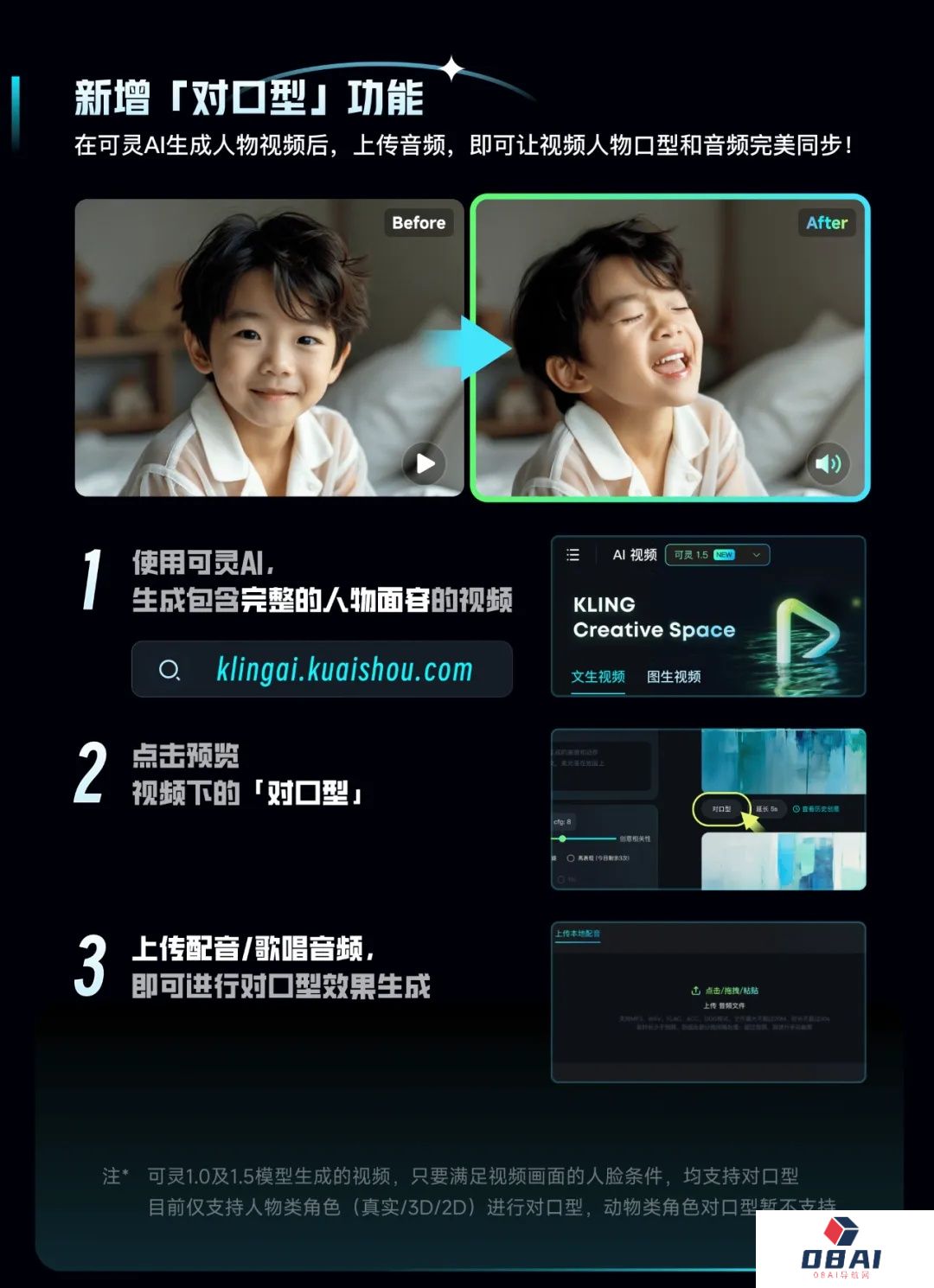 可灵 1.0 及 1.5 模型生成的视频,只要满足视频画面的人脸条件,目前针对“对口型”功能,仅支持人物类的角色,包括(真实 / 3D / 2D)进行对口型,动物类角色对口型暂不支持。