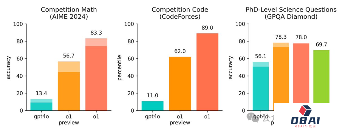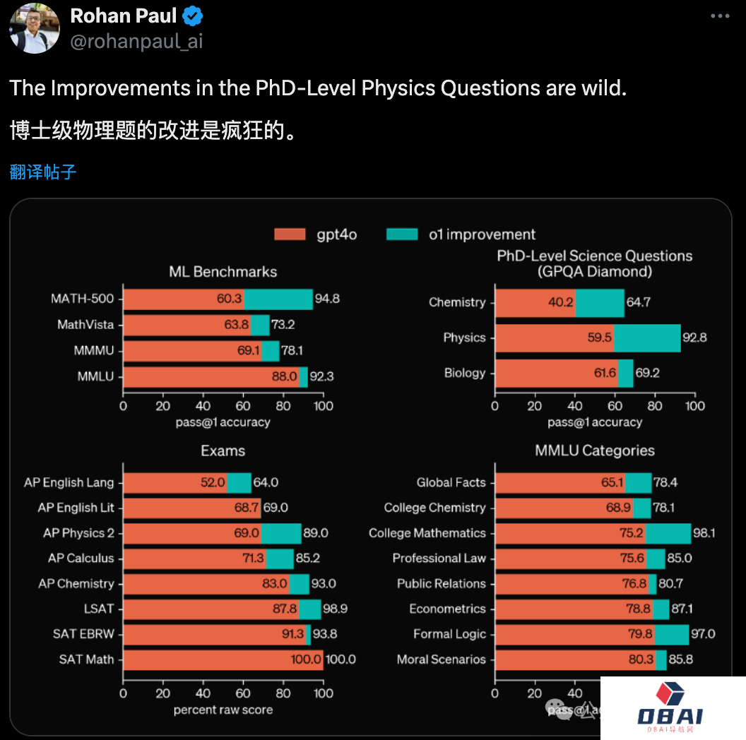 在此前,解决博士水平的物理问题时,GPT-4o还是“不及格”的59分,o1一跃来到“优秀档”,直接干到92.8分。