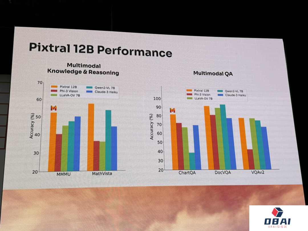 在 Mistral AI 的闭门会议上,官方展示了更多关于 Pixtral 12B 的细节。从官方展示的多项基准测试结果来看,Pixtral 12B 的性能几乎全面碾压了 Phi-3 vision、Qwen2-VL 7B、Claude 3 Haiku、LLaVA-OV 7B。