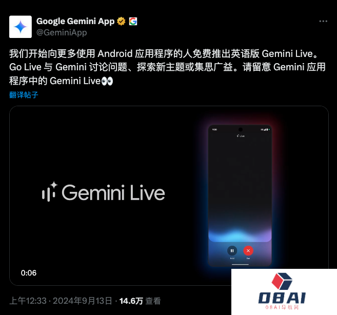 谷歌官方通过 Gemini App 的官方账号发布了 Gemini Live 向安卓用户开放上线的消息。
