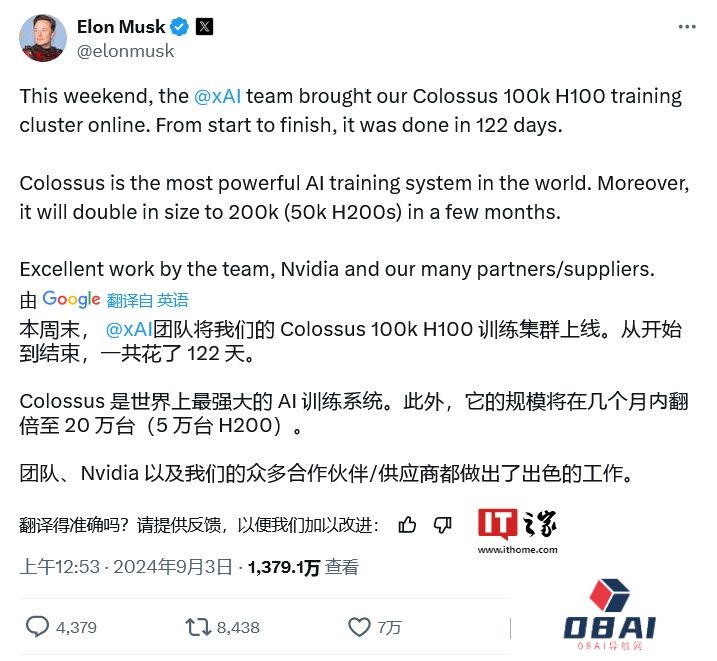 马斯克于 9 月 3 日宣布 xAI 打造的超级 AI 训练集群 Colossus 已经正式上线。Colossus 搭建用时 122 天,共有 10 万张英伟达 H100 GPU 加速卡,而在未来几个月将再翻倍增加 10 万张 GPU,其中 5 万张为更先进的 H200.