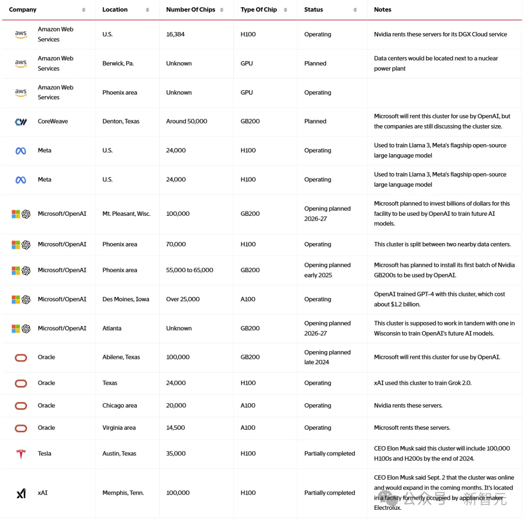 除了Colossus和微软在凤凰城为OpenAI建造的超算集群,多个类似的集群也正处在研发和建设过程中。