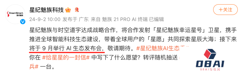 9月2日,吉利汽车旗下的星际魅族科技在官博发文宣布,将于 9 月举行 Al 生态发布会。此外,魅族官方还计划发布LOGO更新,将彻底放弃过去魅族手机时代的LOGO,完全纳入吉利的产品运营体系。