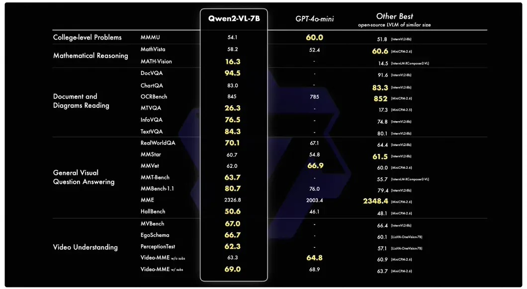 在 7B 规模下,Qwen2-VL-7B 保留了对图像、多图像和视频输入的支持,以更具成本效益的模型大小提供“具有竞争力”的性能。