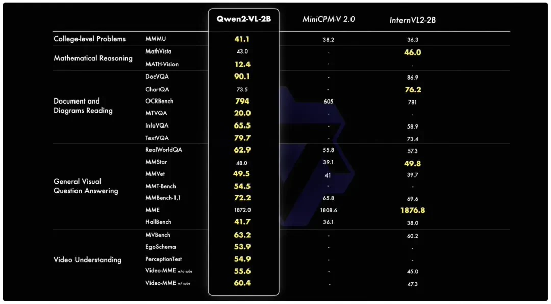Qwen2-VL-2B 模型针对潜在的移动部署进行了优化。尽管参数量只有 2B,但官方表示该模型在图像、视频和多语言理解方面表现出色。