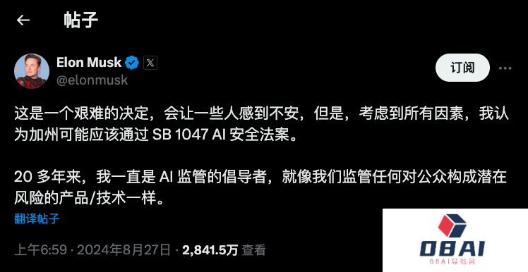 当地时间8月26日,马斯克在推特(X)平台发文,公开表示支持加州 AI 安全法案,该法案预计将对该新兴行业进行更严格的监管。他强调,(这个法案)会让一些人感到不安,但这个法案应该被通过。马斯克还声称自己「20 多年来」一直倡导 AI 安全问题的监管。