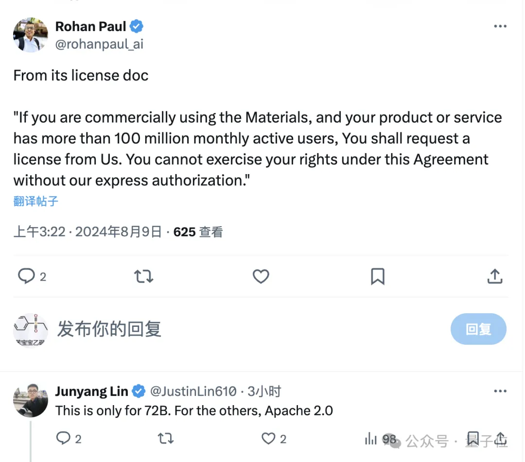 另外,根据Qwen2-Math的许可协议,该模型对大部分用户来说可以免费商用,但对于72B版本,如果每月活跃用户数超过1亿,就需要向千问团队申请许可了。