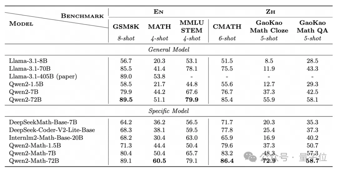 结果,在GSM8K、MATH等经典数学测试集上,Qwen2-Math-72B的数学能力都超过了405B的Llama-3.1.