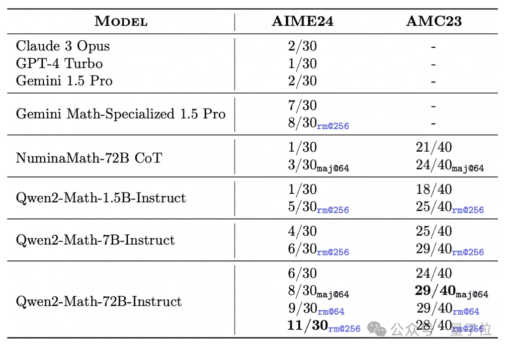 比如在AIME 24的30道题当中,Qwen2-Math-72B-Instruct用rm@256策略能够做对11道。