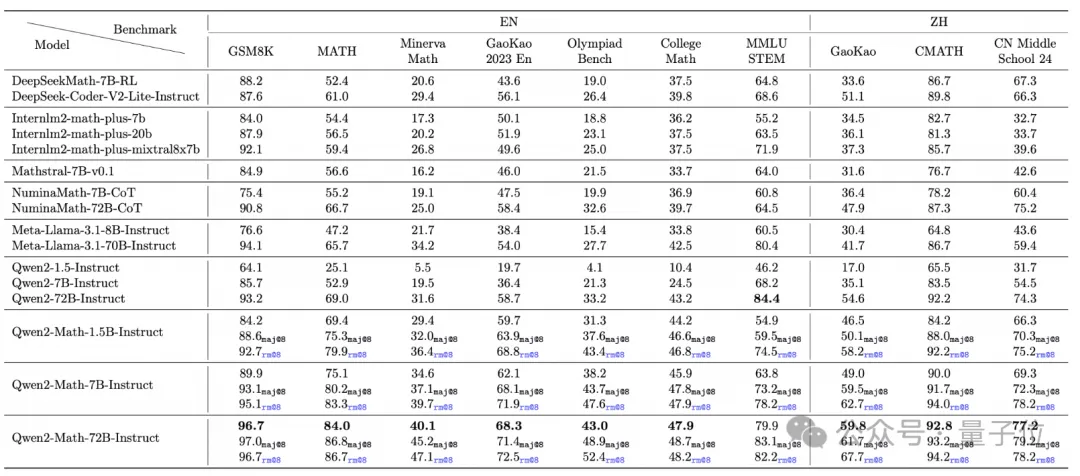 如前文所说,Qwen2-Math共有72B、7B和1.5B三个参数规模,分别由对应规模的Qwen2基础模型改造而成。