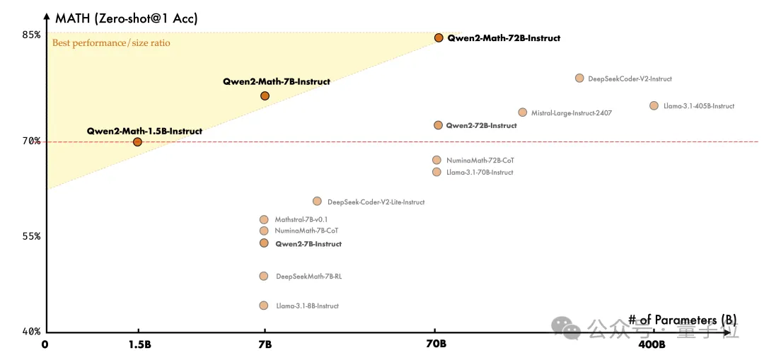 7B版本也用不到十分之一的参数量,超过了72B的开源数学模型NuminaMath。