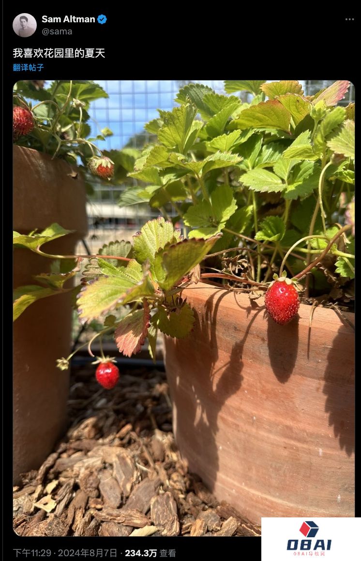 当地时间8月7日,OpenAI CEO 奥特曼近期在推特(X)平台发推文称——「我爱花园里的夏天」。他同时配图晒出花园里边的 5 颗草莓,其中 1 颗是绿色的,可能象征着某种“仍未成熟”的涵义。