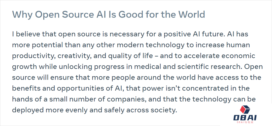 我坚信开源是实现积极AI未来的必要条件。AI相比任何现代技术都有更大的潜力提升人类的生产力、创造力和生活质量,并加速经济增长,同时推动医疗和科学研究的进步。开源将确保世界上更多的人能够享受AI带来的益处和机会,防止权力集中在少数公司手中,使得这项技术能够更加均衡、安全地在全社会推广。