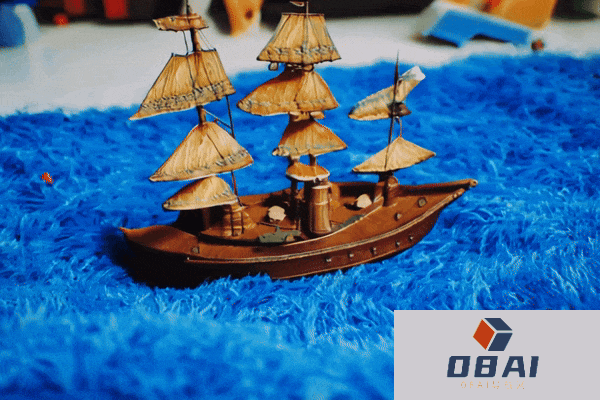 一艘精致的木制玩具船,桅杆和船帆上雕刻着复杂的图案,在模拟海浪的蓝色长毛绒地毯上平稳地滑行。船身漆成浓郁的棕色,并带有小窗户。地毯柔软而有质感,提供了一个完美的背景,就像一片广阔的海洋。船的周围环绕着各种玩具和儿童用品,暗示着一个充满童趣的环境。这个场景捕捉到了童年的天真和想象力,玩具船的旅程象征着在异想天开的室内环境中的无尽冒险。