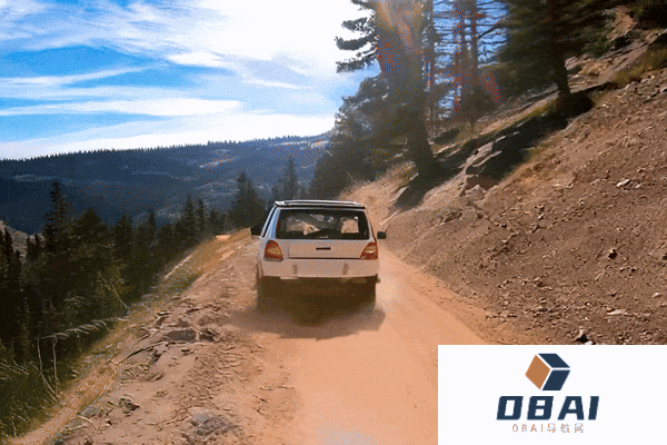 镜头跟在一辆白色复古越野车后面,车顶有黑色行李架,越野车在陡峭的山坡上沿着松树环绕的陡峭土路快速行驶,轮胎上的尘土飞扬,阳光照在越野车上,越野车在土路上快速行驶,给整个场景投下了温暖的光辉。土路缓缓弯向远方,看不到其他车辆。道路两旁的树木都是红杉,还有零星的绿色植物。从后方看,汽车轻松地沿着弯道行驶,仿佛在崎岖的地形上行驶。土路本身被陡峭的丘陵和山脉环绕,头顶是晴朗的蓝天和飘渺的白云。