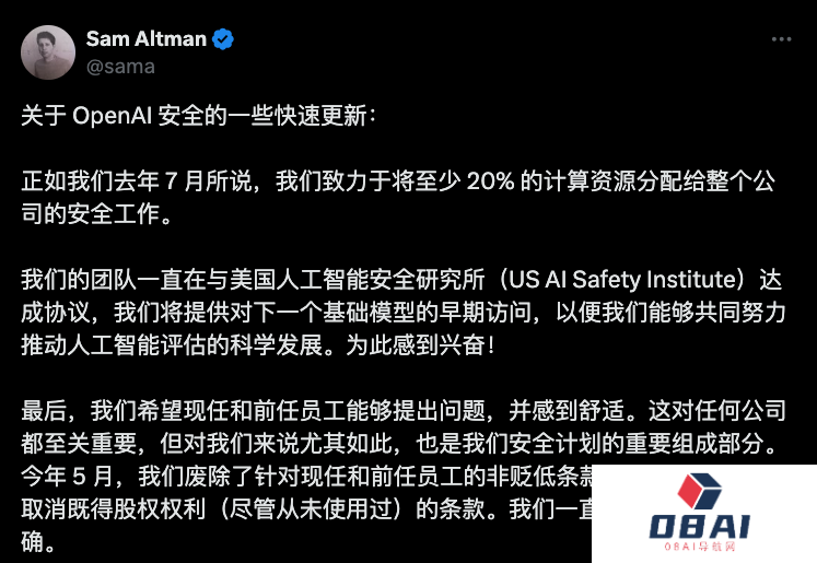 奥特曼在推文中写道:正如我们在 7 月下旬所承诺的,我们公司将保障调配至少20% 的计算资源,用于 AI 安全方面的工作。