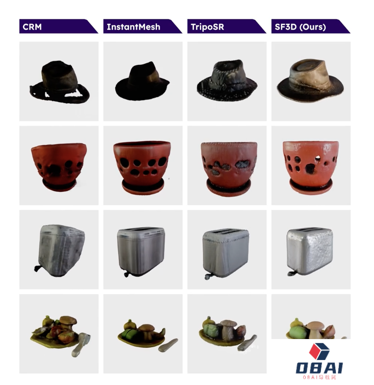 Stable Fast 3D 只需要单张图片即可快速生成高质量的 3D 模型,相关模型自带材质及对应的参数,同时提供了精确的 UV 展开(UV Unwrapping)便于用户进行后期修改,如果用户需要,还可以选择四边形或三角形网格重建功能,相关工作只需多耗费 100 至 200 毫秒时间即可完成,能够允许用户更细致地控制模型网格拓扑结构。