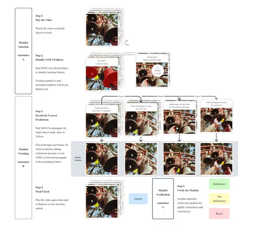 在第一阶段,使用了SAM模型来辅助人类标注。标注者的任务是在视频的每帧中以每秒6帧的速度使用SAM和像素精确的手动编辑工具来标注目标对象的掩码。